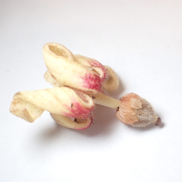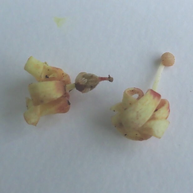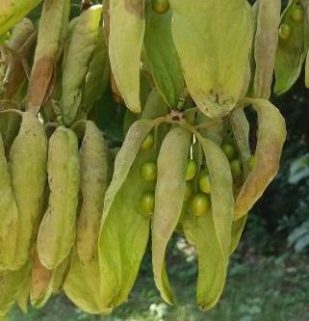 夏から秋にみのる実は、 熟す前に裂けて、 スプーンがくっついたような形になります。