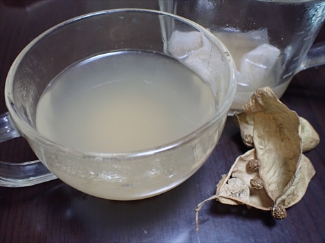 アオギリの実は戦時中のコーヒーの代用品。 秋に実を集めて洗って、 炒って、 挽いて、 お茶パックに入れて、 お湯を注いで作ります。 濃くいれたほうがおいしいですが、 味は豆の煮汁でコーヒーではないです。 そのよどんだ液体をうちの息子が「ガンジス川」と呼び、 ガンジスコーヒーと呼んでいます。 見かけは濁ってますが、 ほんのりアーモンドチョコのような香りがします。 実を焦がし気味に炒るとコーヒーのような色にはなります。
