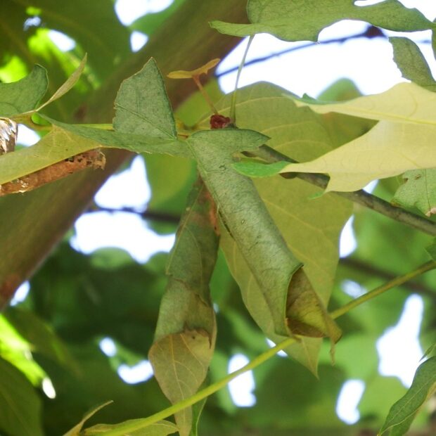 葉がクルンと巻かれているのはガの幼虫のしわざ。 オオワタノメイガやワタノメイガの幼虫が中に隠れています。