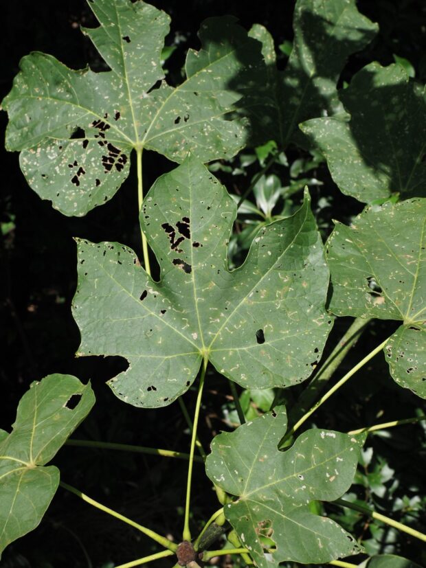 青い幹と大人の顔ぐらいある大きな切れ込みの入った葉っぱも特徴があります。