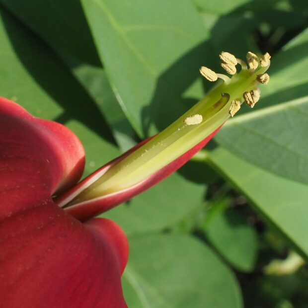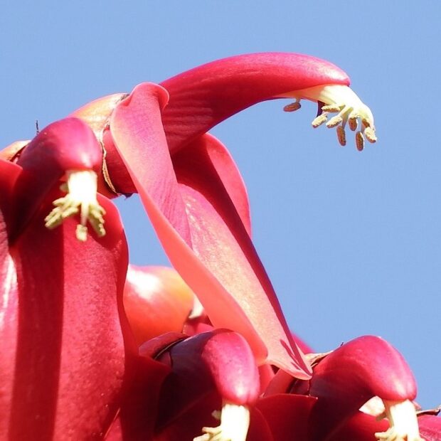 真っ赤な花が沢山咲きます。 一つの花は、 大きくて平らな花びらと筒状の花びらから出来た面白い形です。 滴るほどたくさんの蜜(みつ)が出ます。