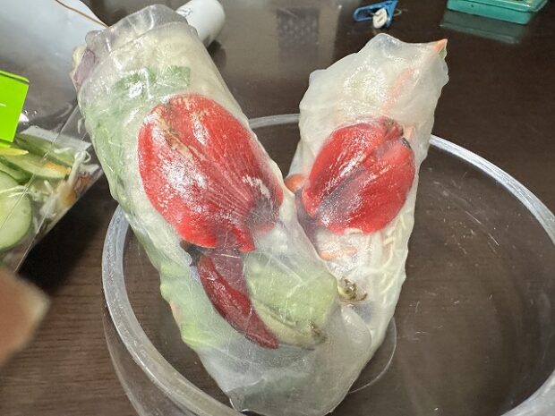 ブラジルでは花は食べられ、 サラダや煮て食べるようです。 花をお皿に添えると一気に南国風の料理?リゾート感が出ます。 ライスペーパーに花とサラダを巻くと、 とってもきれいですが花は後味が苦いです。