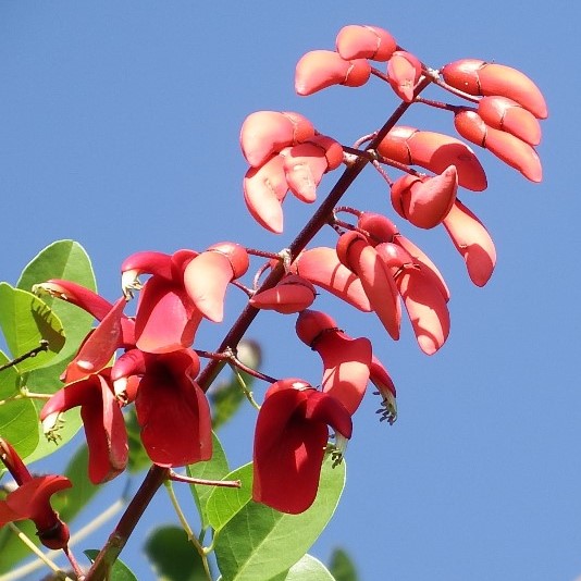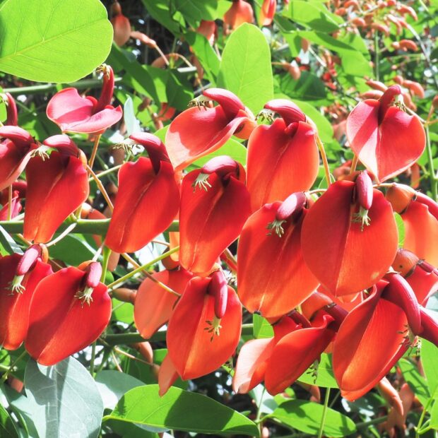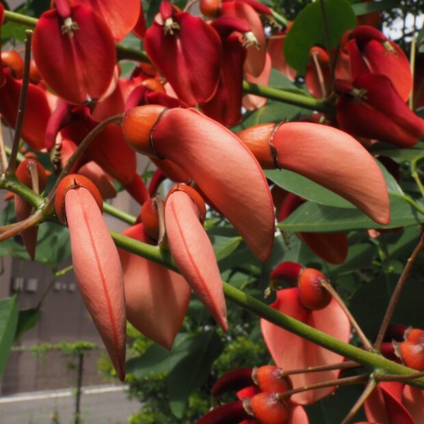 真っ赤な花が房になって咲き、 ゴージャスです。 カイコウズ(海紅豆)とも呼ばれます。