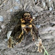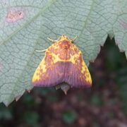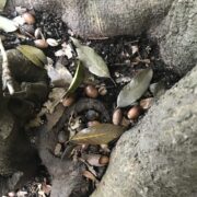 くるっと巻いている葉は、 マダラマドガ(ガ)の幼虫の住みか。 ドングリに来る小さなゾウムシの仲間を探してみましょう。