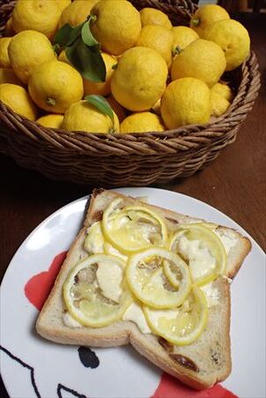 トーストにクリームチーズをたっぷりぬり、 スライスしたユズ(ユズの種はとる)、 ハチミツをかけてトースターで焼きます。
