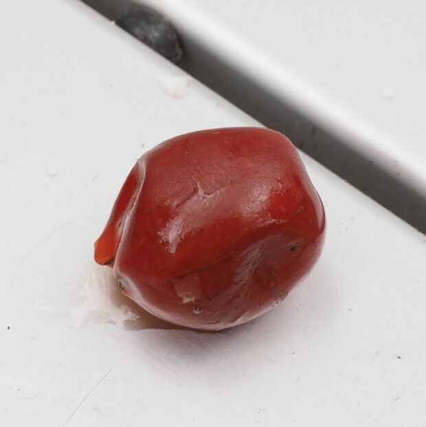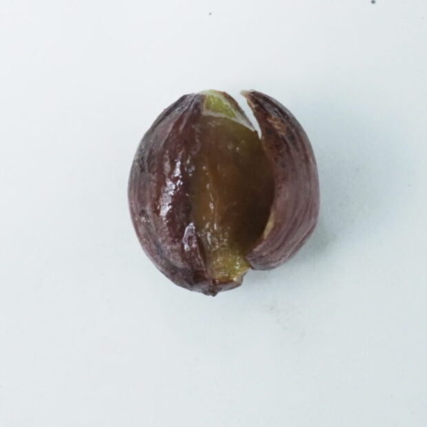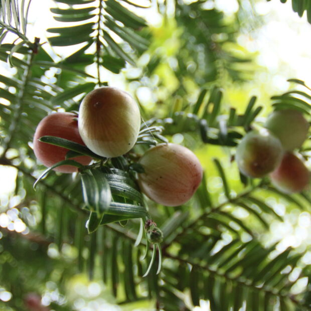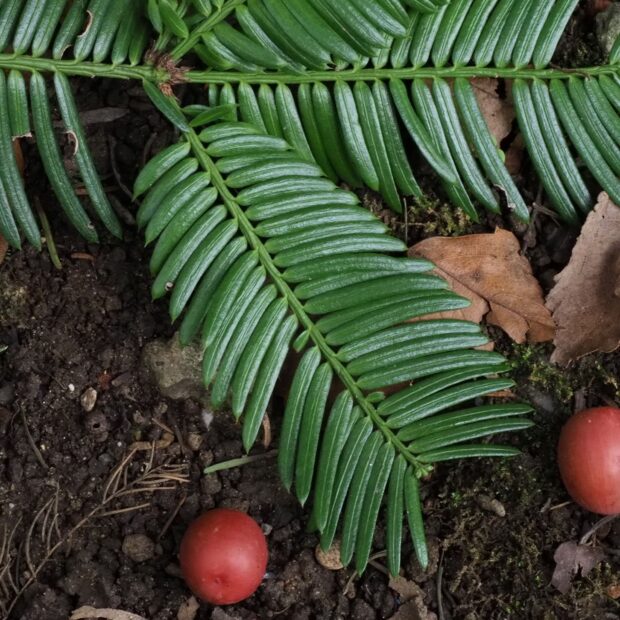 花が咲いた翌年の秋に赤~茶紫色のタネが実ります。 外側のぶどうの果肉みたいな部分は、 タネの皮が厚くなったものです。 食べると一瞬甘いけど、 「うーん」なお味、 樹脂の独特の匂いがします。