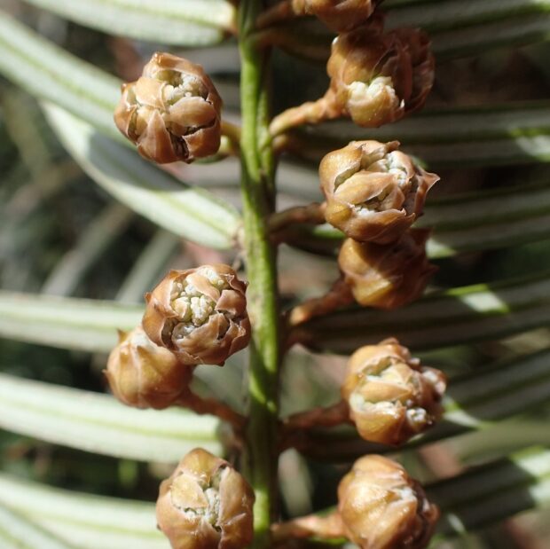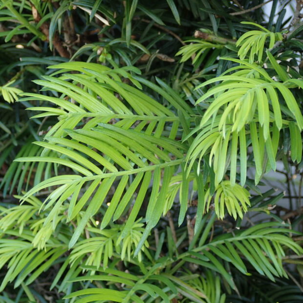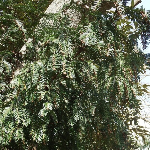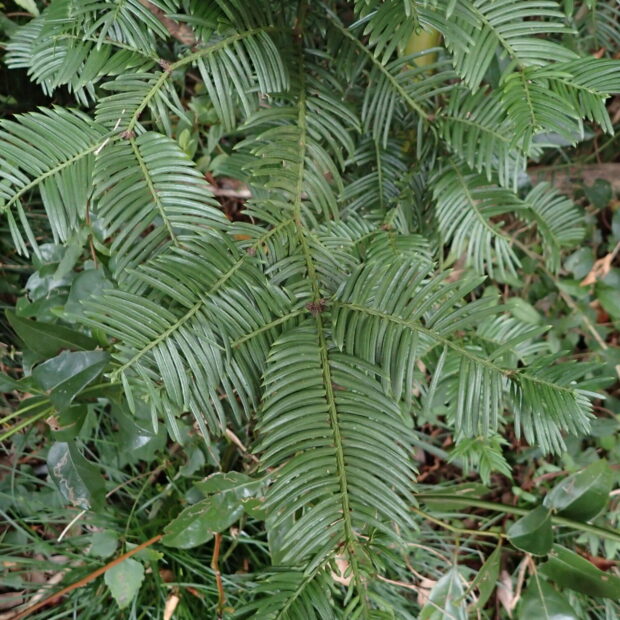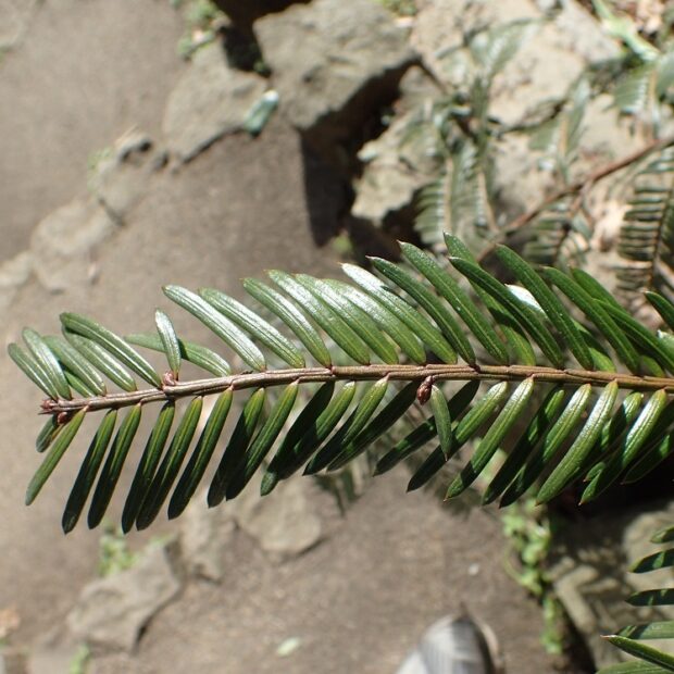 葉は交互に2列に並びます。 先がとがっていていたそうですが、 じつは柔らかく、 にぎっても痛くないです。 カヤより長めの葉です。