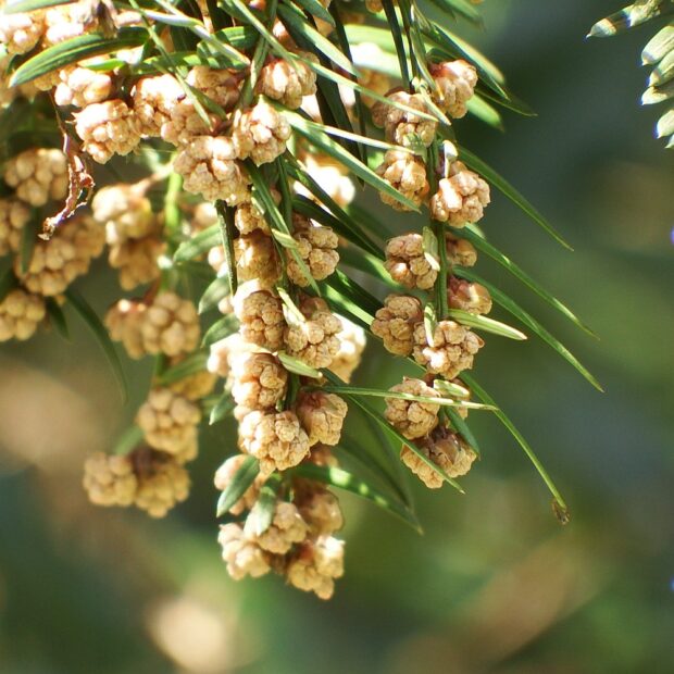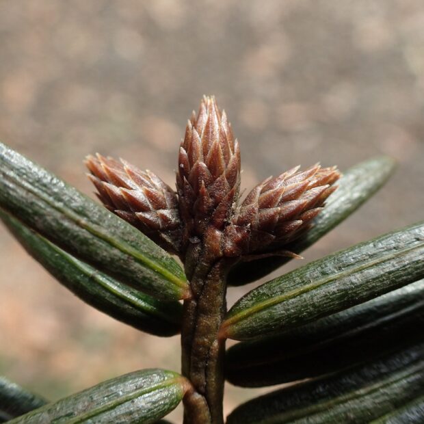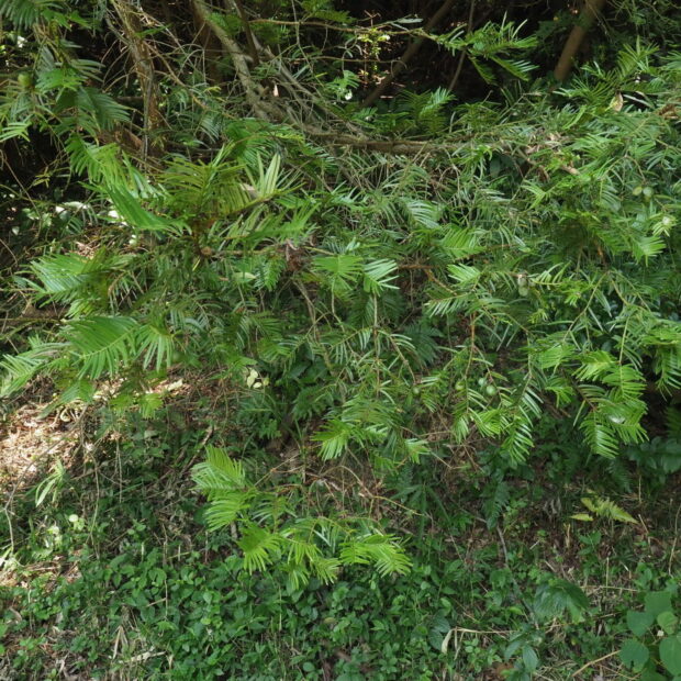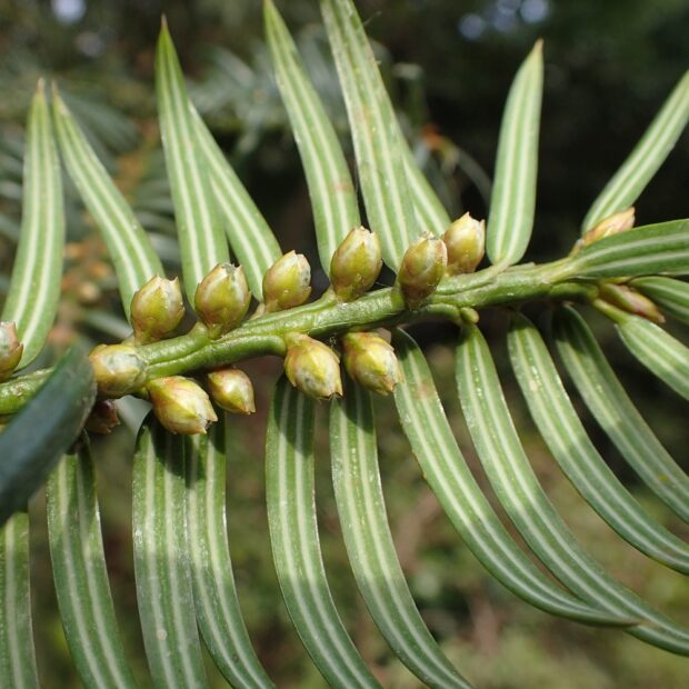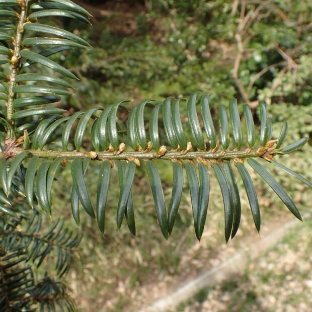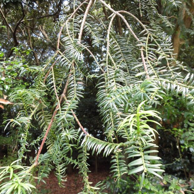 木材は耐朽性があって粘りがあるということで縄文遺跡からイヌガヤで作った弓が出土しています。 また種は絞って灯火用の油にしていたそうです。 近年ではイヌガヤの葉の物質が、 慢性骨髄性白血病の抗がん剤となり利用されています。