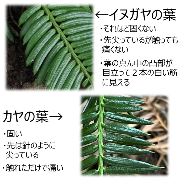 葉をよく見て、 イヌガヤかなーと思ったら、 そーっと握手してみましょう。 痛くなくて大丈夫なら思い切って握手して友達になりましょう。 痛かったらカヤなので、 握手はあきらめましょう。
