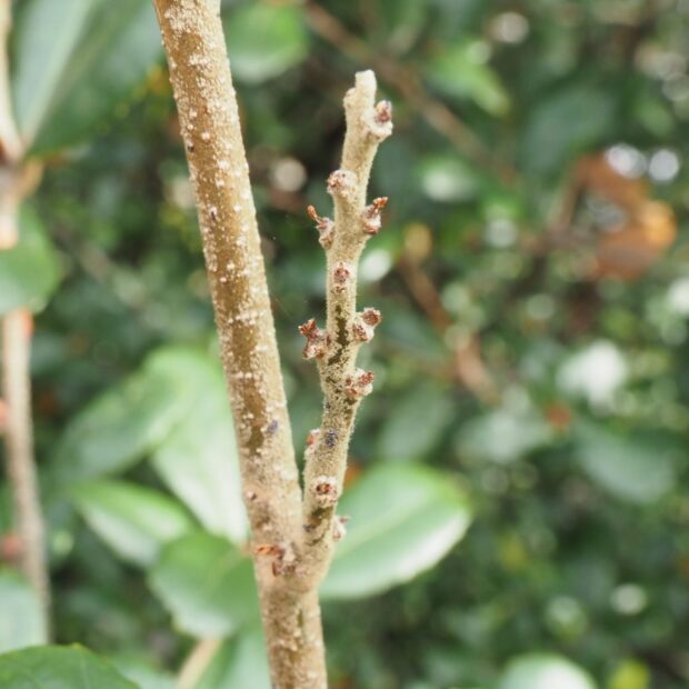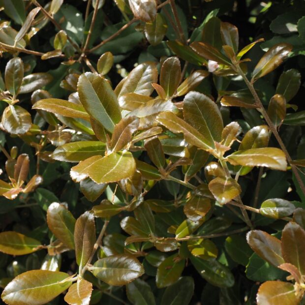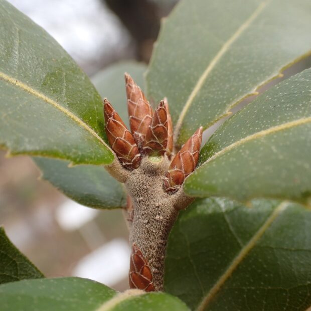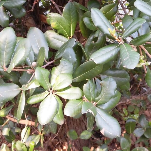 厚みがあって光沢のある葉です。 新芽が褐色。