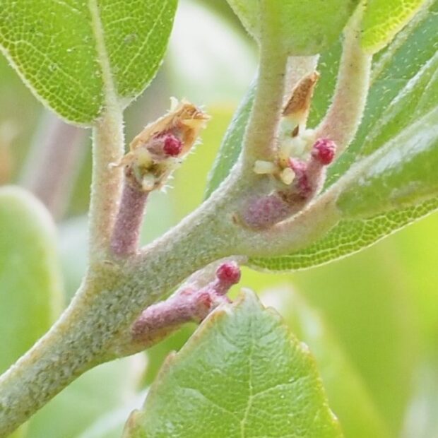 雌花は赤くて小さく目立ちません。 枝の先端近くの葉の付け根に咲きます。