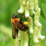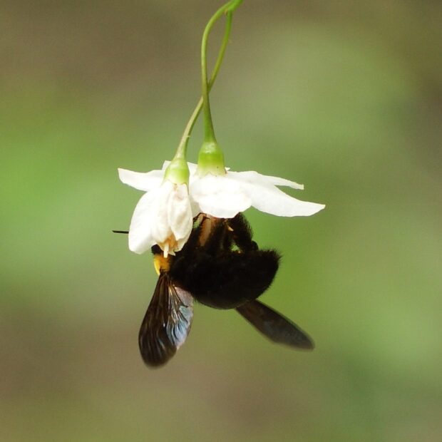 • 密や花粉を求めて花にぶら下がるキムネクマバチ。
