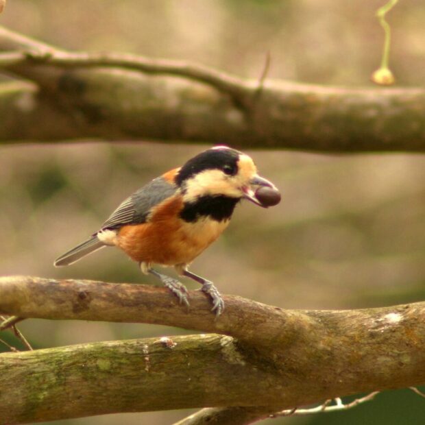• 堅い種のカラを上手に割って中身を食べるのはヤマガラの特技。 安心して食べられる場所に移動して食べたり、 貯めておくためにどこかに隠したりします。