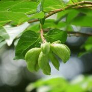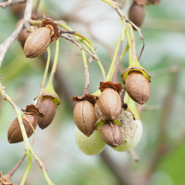 花には、 クマバチなどのハナバチの仲間が集まります。 クルッと巻かれた葉がぶら下がっていたり、 葉に丸い穴の食べ跡があればオトシブミがいるかもしれません。 また堅い種の中身はヤマガラの大好物です。