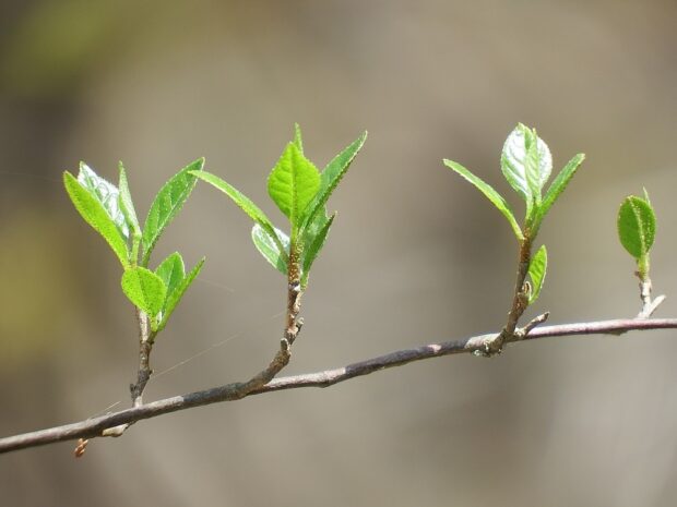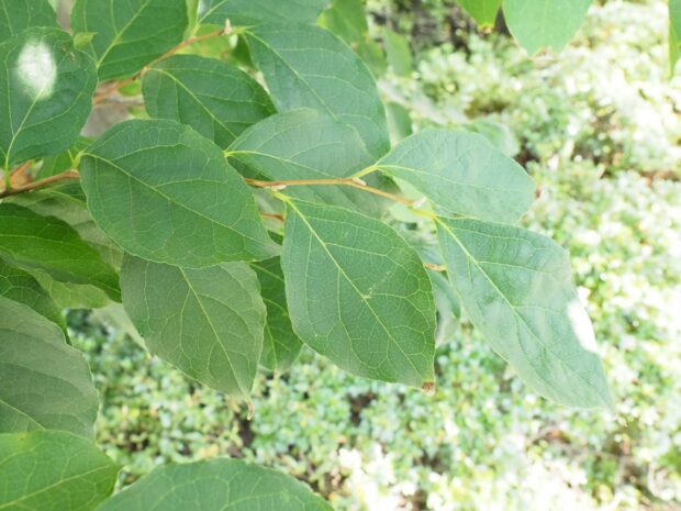 葉は薄く、 先端がとがっています。 葉の縁(ふち)には浅いギザギザがあります。 互生で、 枝に互い違いにつきます。