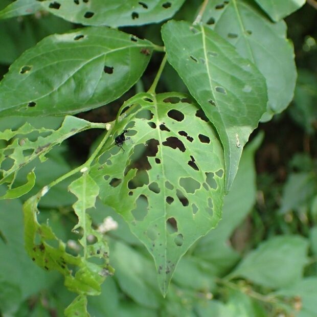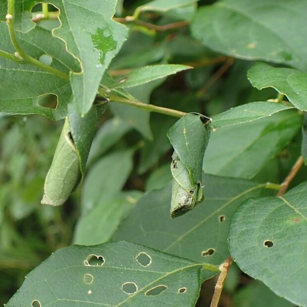 • 丸い小さな穴はエゴツルクビオトシブミの成虫が食べたあと