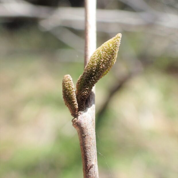 • 芽吹き始めた冬芽。 独特の星状毛が目立つ。