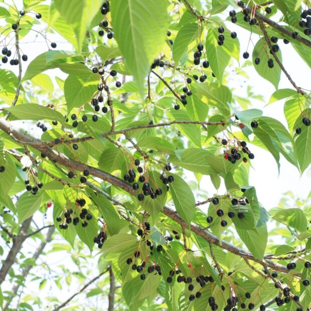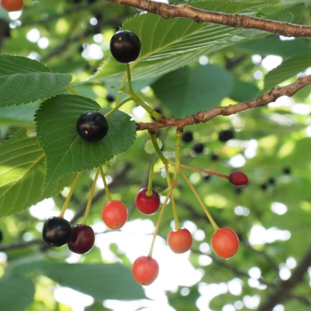 直径1~2㎝程の球形のみがなります。 初めは赤ですが、 さいごは黒紫色に熟します。 ちょっとえぐみがありますが甘いです。 ※食べるときは自己責任で食べてください。