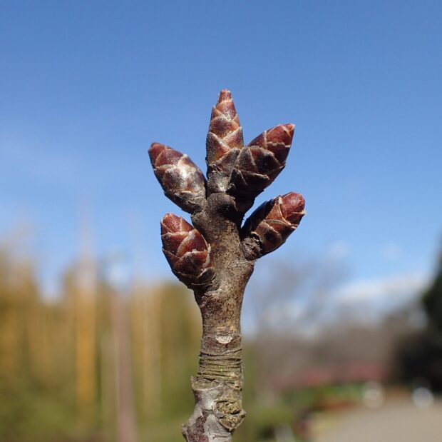 がっしりとした芽鱗(がりん・魚の鱗のような形をしており、 何枚も重ねて芽を守っている)に包まれています。 毛はありません。