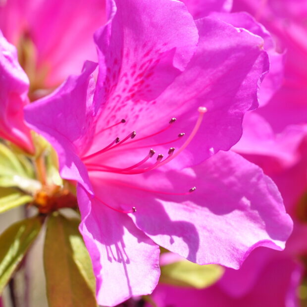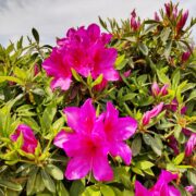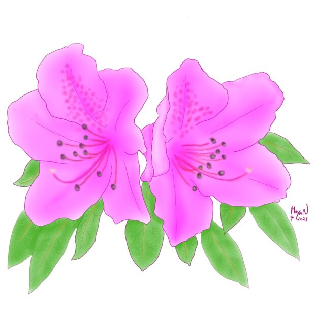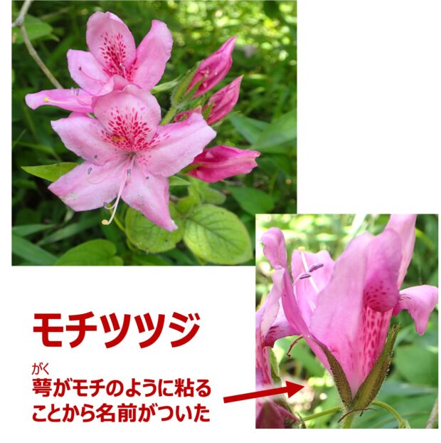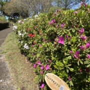 花が大きく赤紫色であることから「オオムラサキ」と呼ばれています。 ツツジの名前の由来は諸説ありますが、 次々花が咲くことから「続き咲き花」→つつじとなったという説があります。