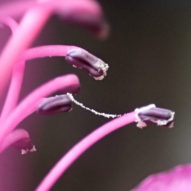 大きな赤紫色の花が木全体に咲きます。 筒状の花びらは5つに裂けています。 良く見ると花びらには模様があります。 これは、 虫に受粉を手伝ってもらうための蜜のある場所を教えるための目印です。 赤い色は特にアゲハチョウなどの大型の蝶を引き付けるためと考えられます。