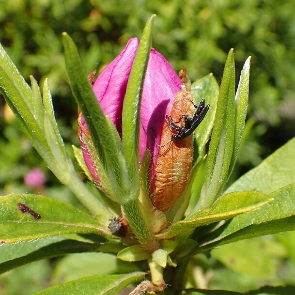 ルリチュウレンジはるり色の小さなハチ。 メスが卵を産んでいたり、 幼虫が葉を一生懸命食べている姿を見ることができます。