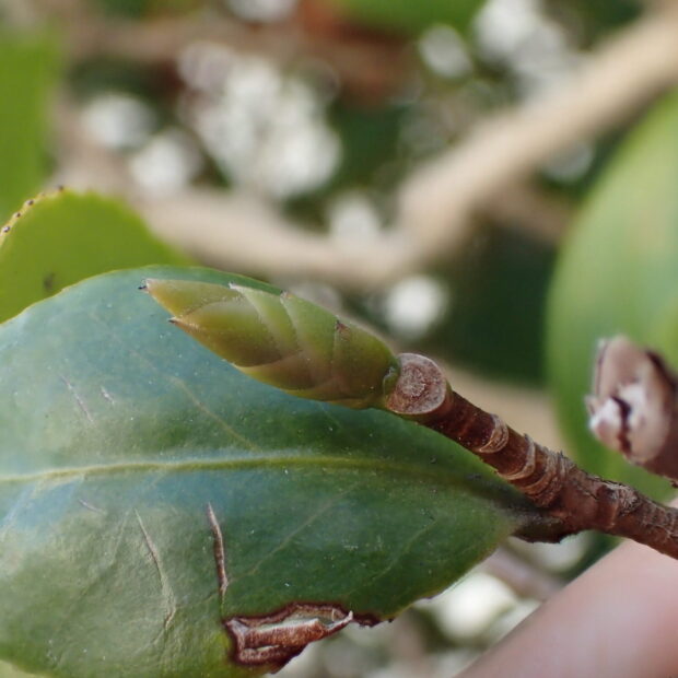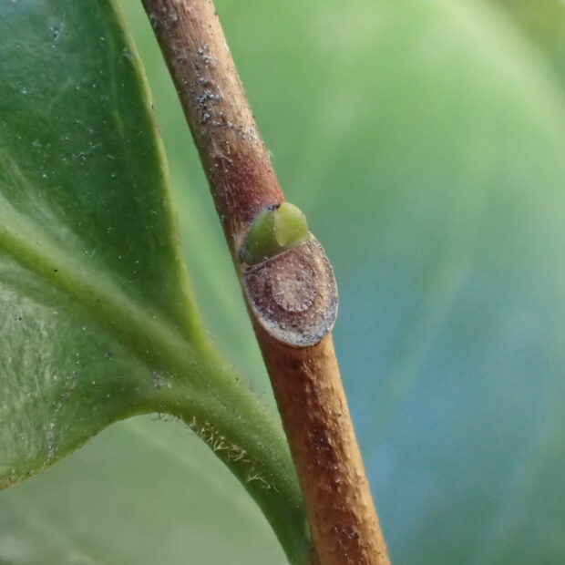 葉裏と同じような黄緑色で、 毛がなくツルッとした大きな芽です。 葉痕の維管束痕は1つで、 にっこり顔です。
