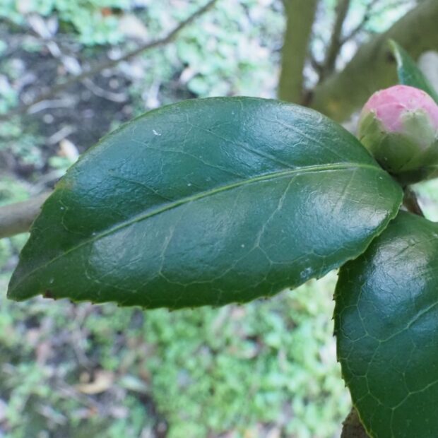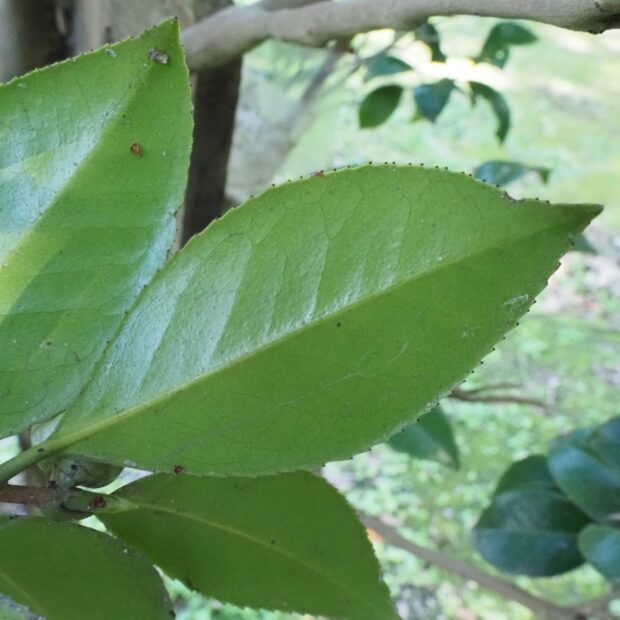 光沢のある厚みのある葉っぱです。 一枚の葉は何年も木についていて光合成をします。