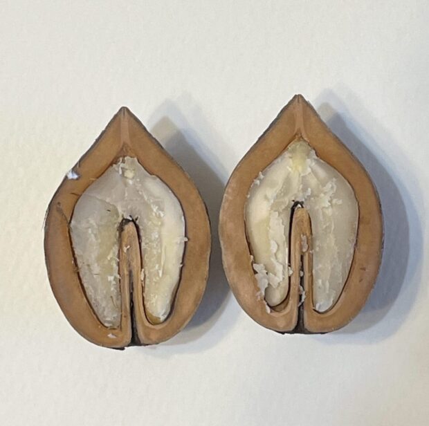 • オニグルミの殻を割ると中から食べられる柔らかい部分が出てくる。