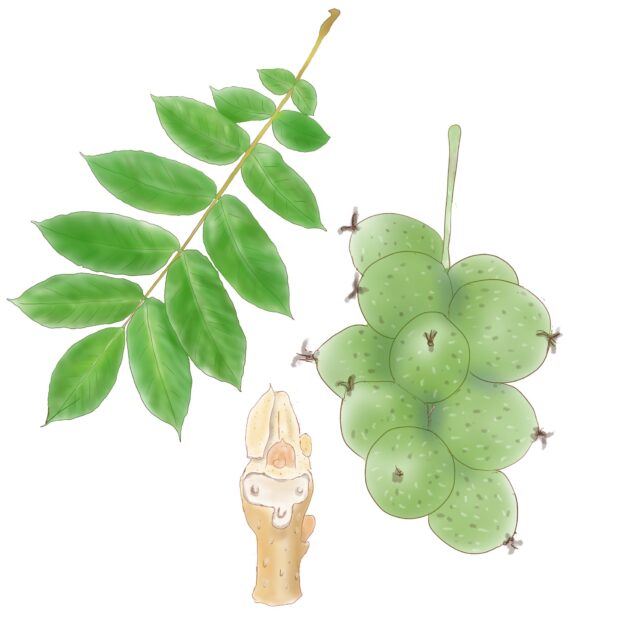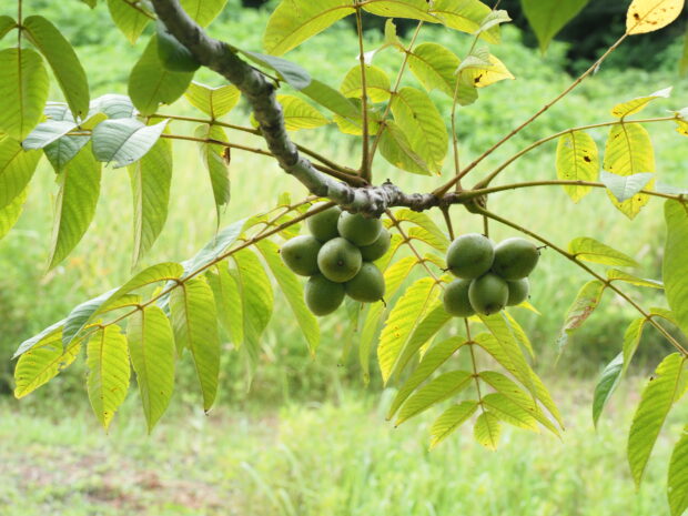 沢や川辺に分布する野生のクルミです。 種は硬い殻につつまれていますが、 栄養があって、 リスやノネズミなどの食べ物になります。 また縄文時代から人にとって重要な食べ物でした。