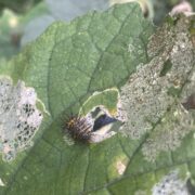 クルミハムシの幼虫は、 葉を食べつくすことがあります。 幼虫を食べにカメノコテントウがやってくることも。