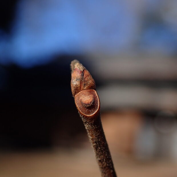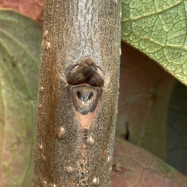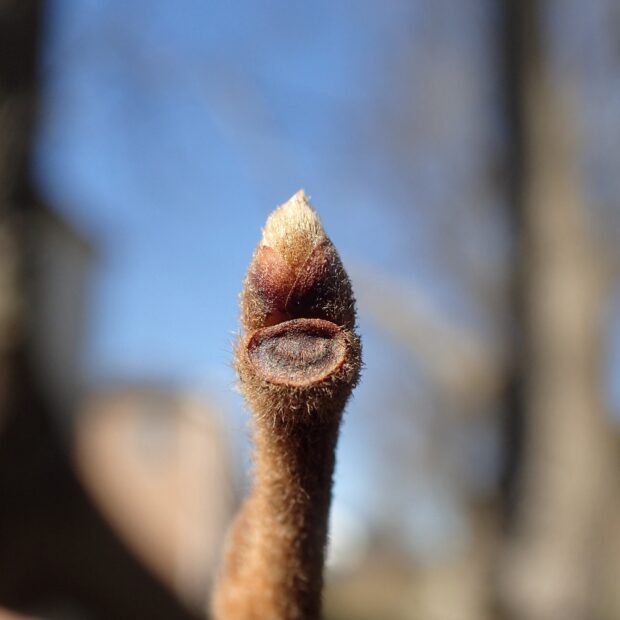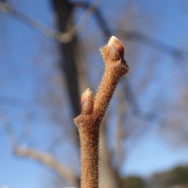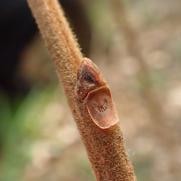 おにぎり型の冬芽で、 横から見ると少し平べったく見えます。 枝には毛があるものとないものがあります。 茶色っぽい葉痕の維管束痕は1つ。 日に焼けたおっちゃんのようです。
