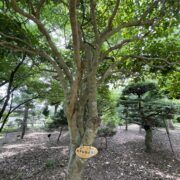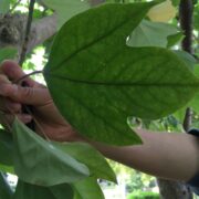 若い木はには、 先が三つ四つに裂けている面白い形の大きな葉が多いです。 木が大きく成長してくると、 裂けていない普通の形の小さめの葉が多くなります。