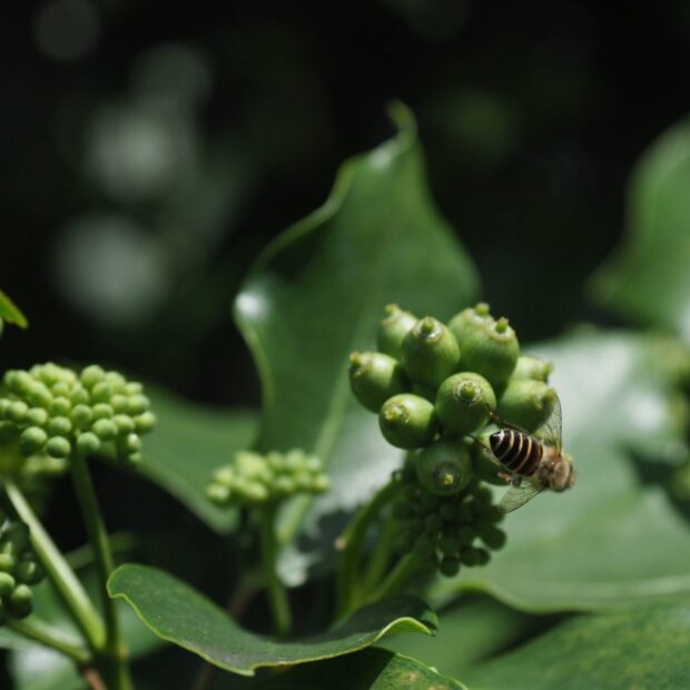 真夏に咲きます。 緑色で目立たない花ですが、 虫に大人気。 ぜひ見つけてください。