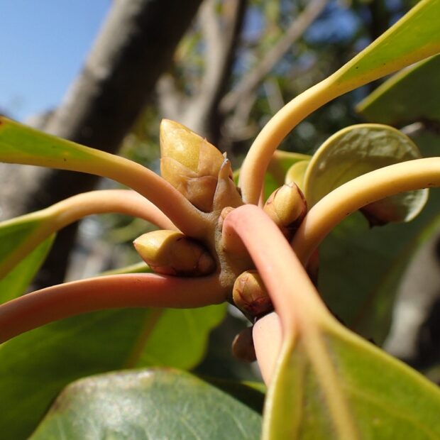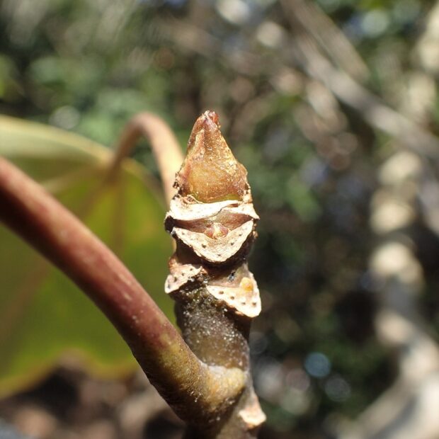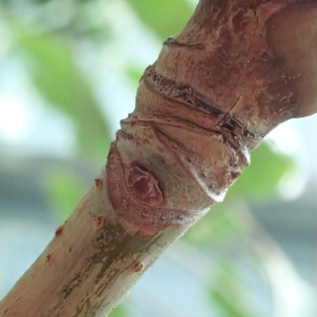 枝先にぐるりとつく葉の真ん中に、 ずんぐりした水滴型の小さな芽があります。 何枚かの葉が落ちたところには、 ブーメラン型の葉痕が互い違いに並びます。
