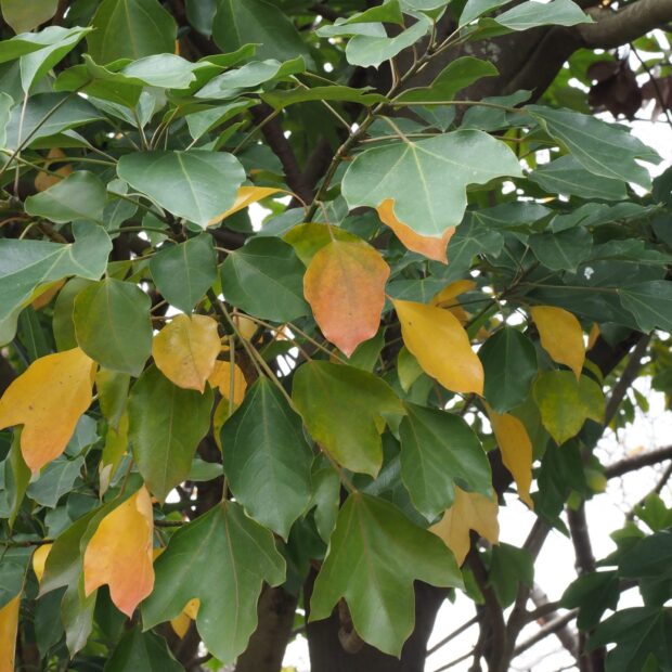 若い木はには、 先が三つ四つに裂けている面白い形の大きな葉が多いです。 木が大きく成長してくると、 裂けていない普通の形の小さめの葉が多くなります。