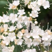 アジサイを小さくしたような白い花が初夏(5-6月)に咲き、 独特の匂いがを放ちます。 コガネムシなどに大人気でレストランのようです。