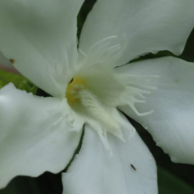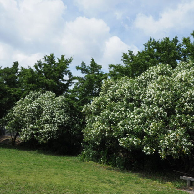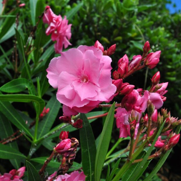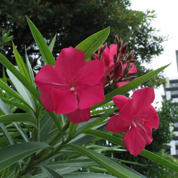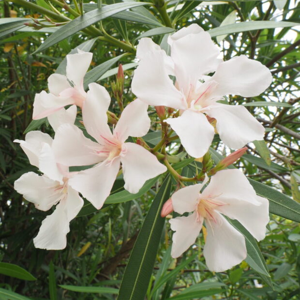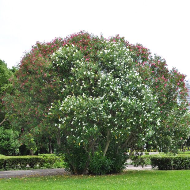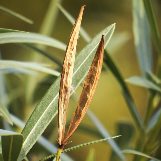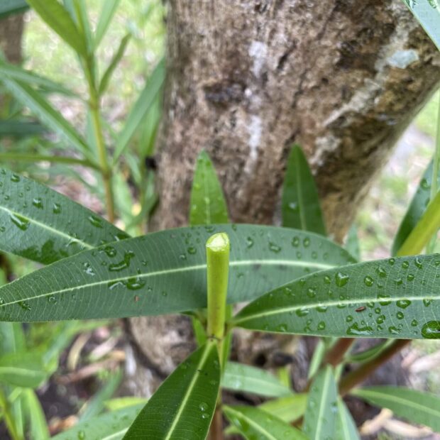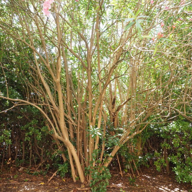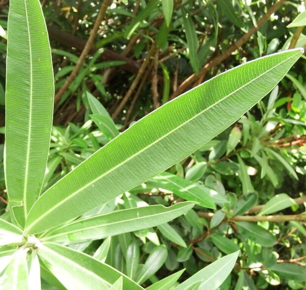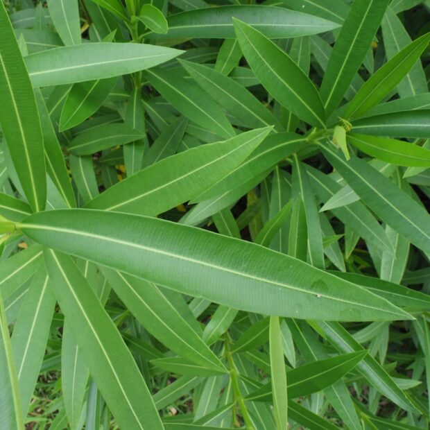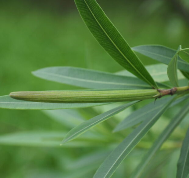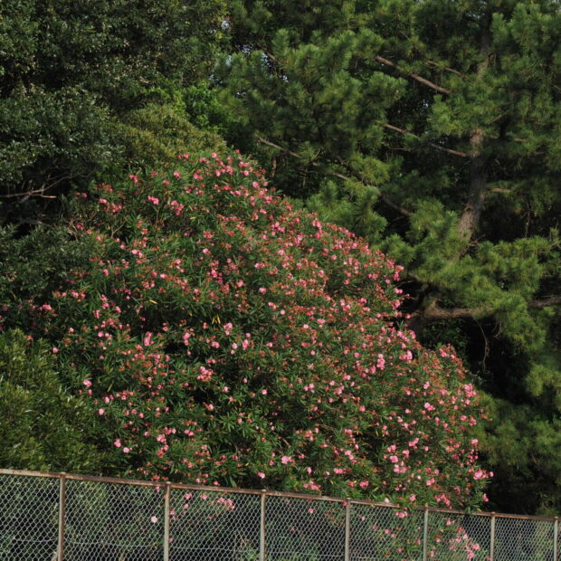 インド原産で、 竹やモモに似ていると言われ、 花の少ない夏に咲き誇り、 ガツガツ下から枝葉を出します。 全部切っても不死鳥のごとく枝葉を出します。 有毒植物で、 葉を食べた動物は死んでしまいます。 南ではきっと激しい生存競争があるのでしょう。 強くなくては生き残れません。