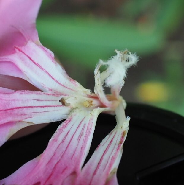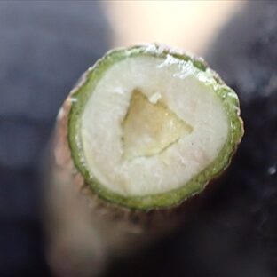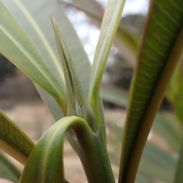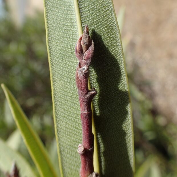 キョウチクトウの枝を切ると、 三角の髄(芯の部分)があります。 良く見ると新しい緑の枝は三角の形をしています。 観察してみましょう。 有毒植物ですが、 触るのは大丈夫です。