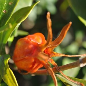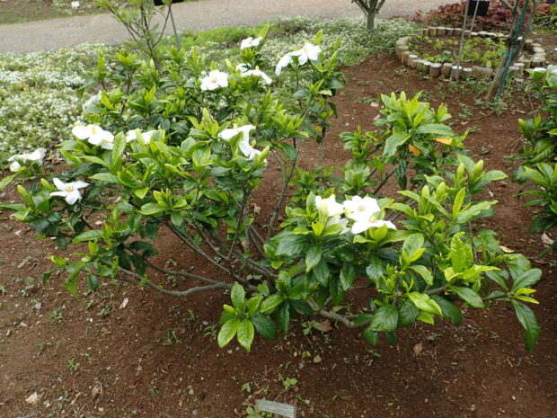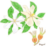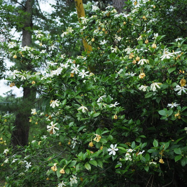 白くて大きな花はとても強いよい香りがします。 秋に実る実は、 お正月の栗きんとんを黄色く染めるのに使われます。 もともとは静岡以西の木ですが、 庭木として東北南部まで植えられます。