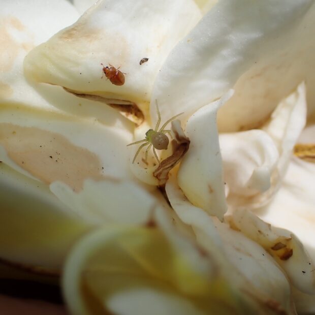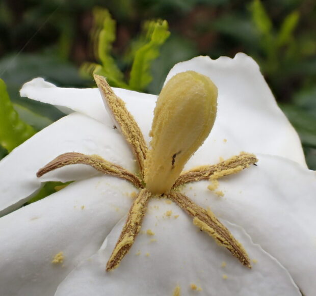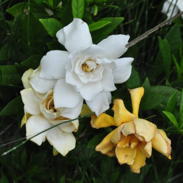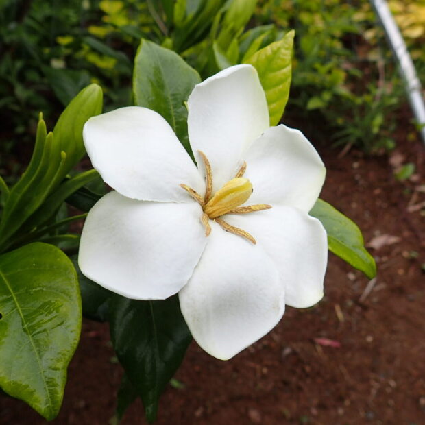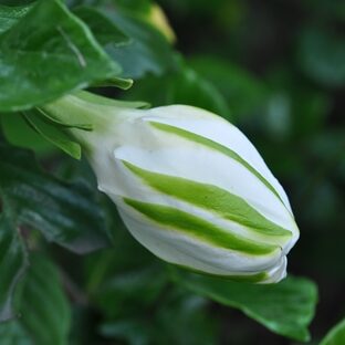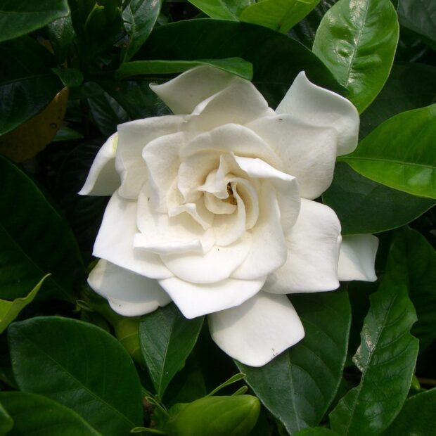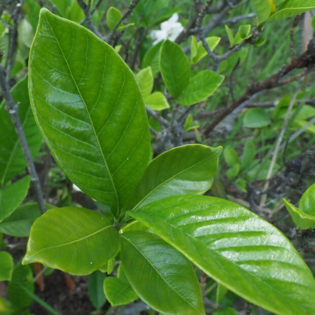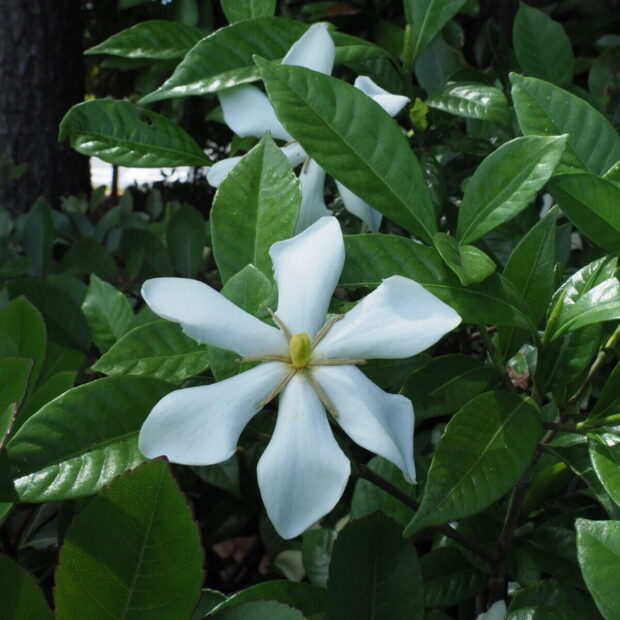 白く大きな花のつぼみはソフトクリームみたい。 ひらくと香りが強く、 存在感アップ。 八重咲きのヤエクチナシなどもよく植えられます。