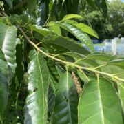 たくさんの動物に大人気の木。 クリの葉は虫の食べあとだらけ。