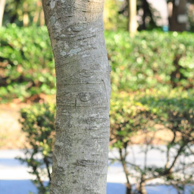 なめらかな灰白色の樹皮で、 皮目(かわめ・樹皮の裂け目)があります。