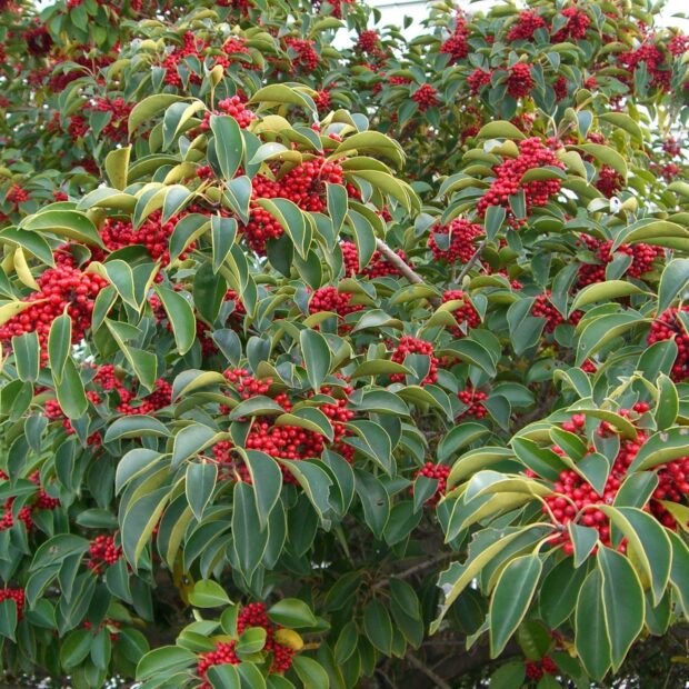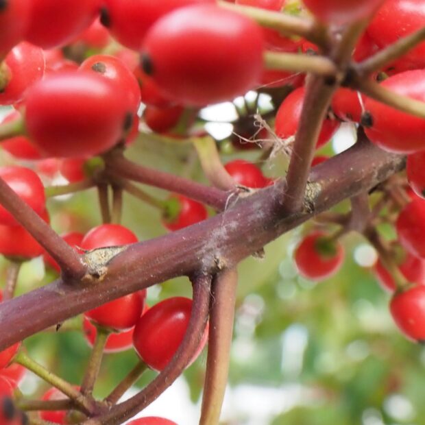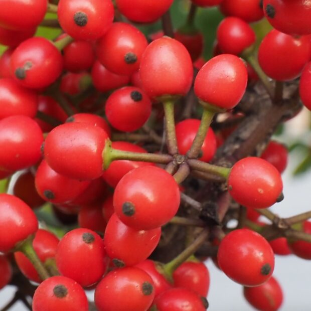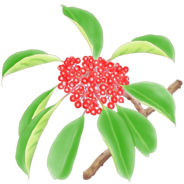 沢山実る赤いピカピカの実が小さいけれど沢山みのるので目立ちます。 秋にみのった実は冬になっても長い間木についています。 「苦労せず金持ちになる」に通じるネーミングから縁起木として知られています。