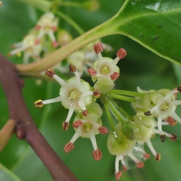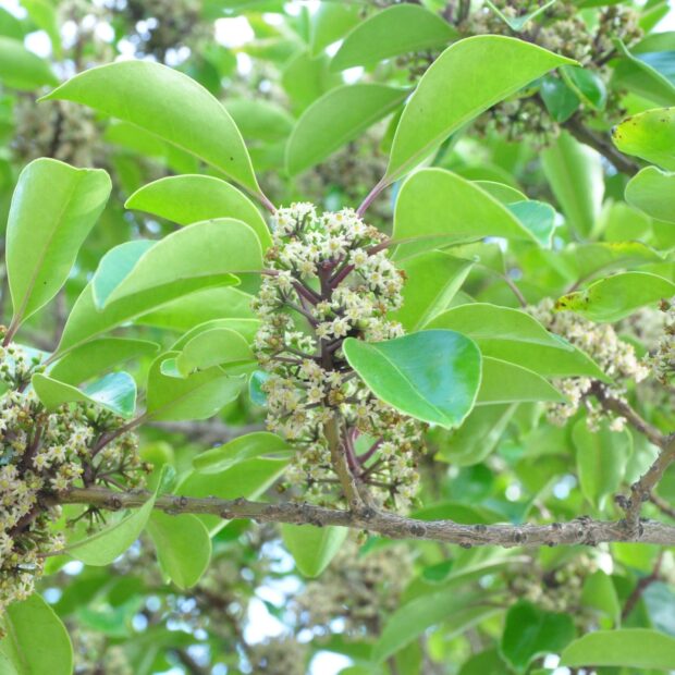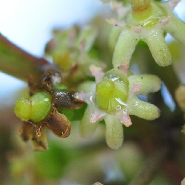 雄花と雌花が別々の木に咲きます。 小さな白または淡い紫色の花をたくさん咲かせます。