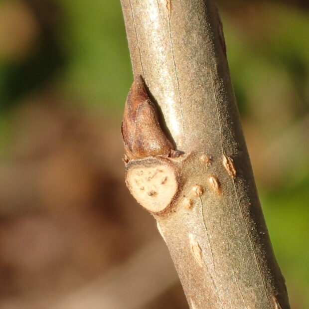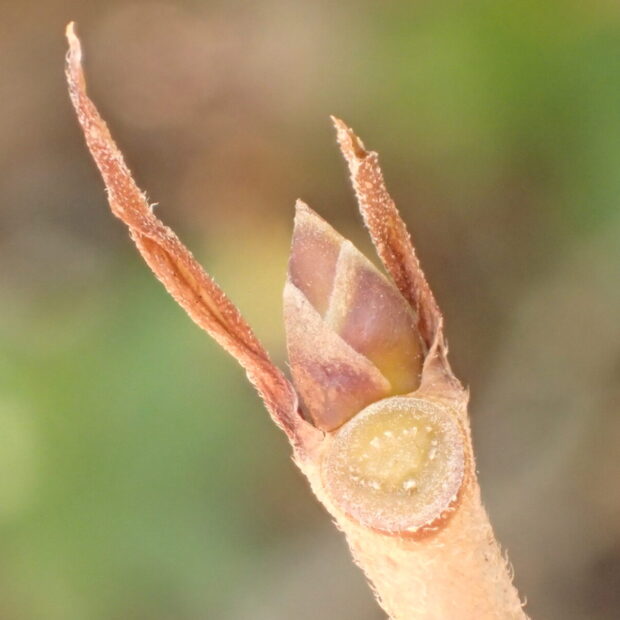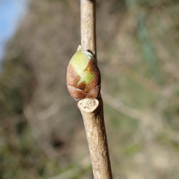 冬芽は水滴型の淡い褐色〜褐色をしており、 その配色が地味に美しい。