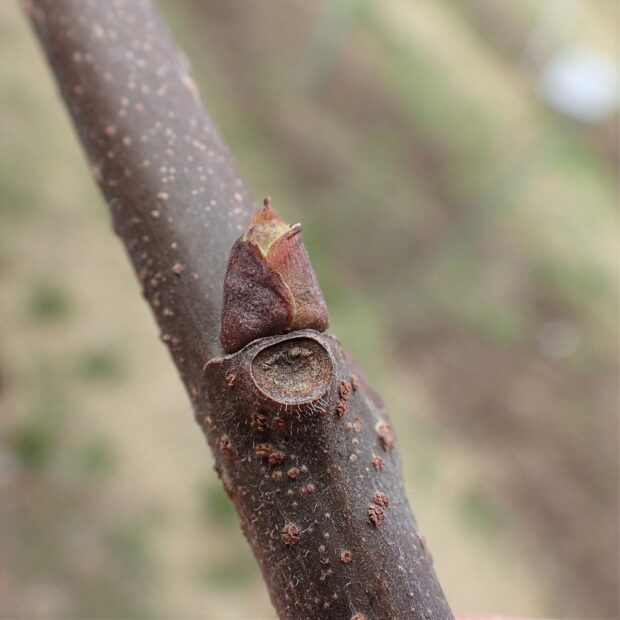 冬芽は丸みをおびた三角形、 お結び型です。 二枚の毛の生えた芽鱗(がりん=冬芽をつつむ皮)があります。