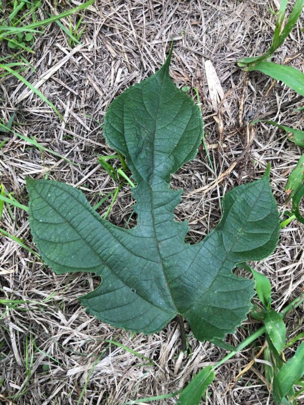 幼木の時は切れ込みが入った大きな葉をつけます。 葉の周りには、 細かいギザギザがあります。