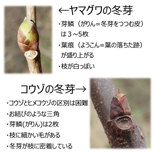 ・コウゾとヤマクワもよく似ていますが、 花・実・冬芽・葉の手触りなどで見分けられます。