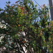 赤い花は、 後ろに鎧(よろい)のように硬くて厚い萼がついています。 厚い皮の実は、 割ると美しい赤色のツブツブが沢山入っています。